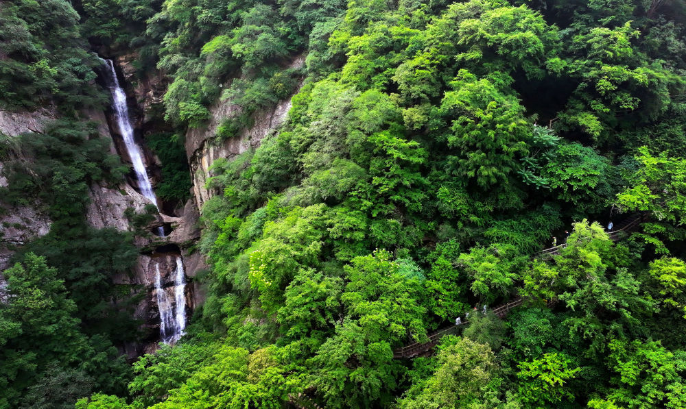 ↑游客在西安太平國家森林公園游覽(無人機照片,5月26日攝)。