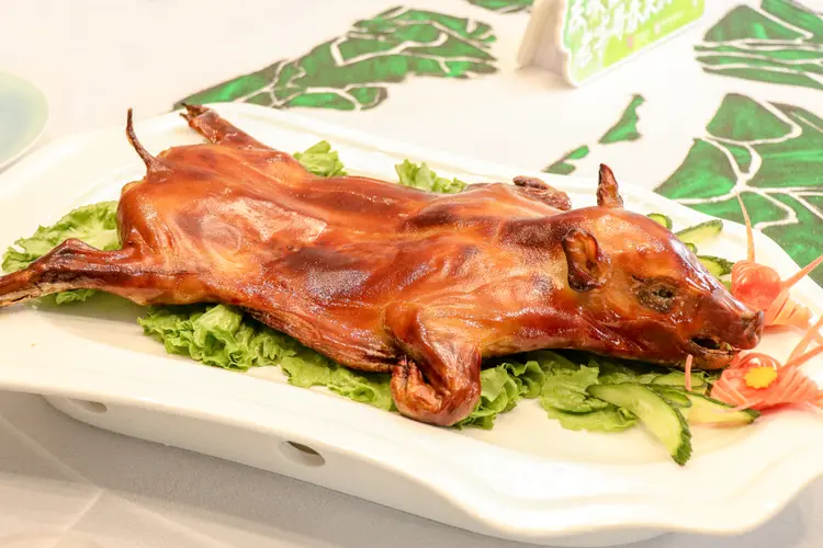 如今的烤乳豬在古法基礎(chǔ)上大幅革新。選用三個(gè)月大的乳豬,以汾酒、腐乳、五香粉等調(diào)料腌制數(shù)小時(shí),去除腥味的同時(shí)賦予肉質(zhì)醇厚底味??局茣r(shí)改用現(xiàn)代控溫烤爐,先以中火烘熟內(nèi)部,再調(diào)高溫度炙烤表皮,期間反復(fù)刷涂糖水以形成酥脆焦糖層。全程耗時(shí)約三小時(shí),成品外皮金黃酥脆,肉質(zhì)細(xì)嫩多汁,既保留了傳統(tǒng)風(fēng)味,又契合現(xiàn)代人對(duì)效率與口感的雙重需求